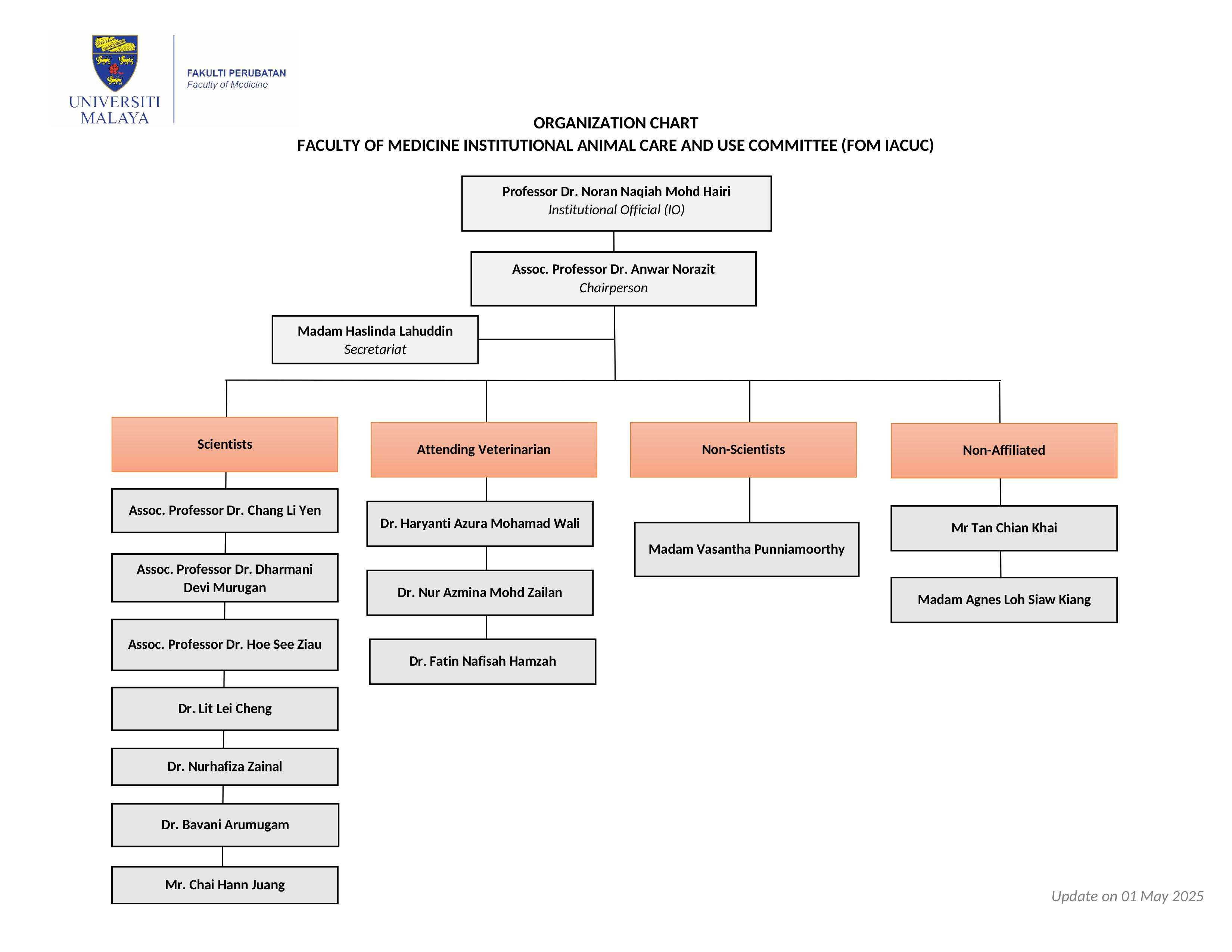 The Faculty of Medicine Institutional Animal Care and Use Committee (FOM IACUC) was established in the Faculty of Medicine in 2013. The FOM IACUC is responsible to provide oversight for the care and use of animals at the Faculty of Medicine. Any researcher/staff/student who intends to conduct work, which involves the use of animals in the animal facility located in the Faculty of Medicine, must submit an Animal Use Protocol (AUP) application to FOM IACUC. The FOM IACUC reviews the AUP application and approves it before the animal work is allowed to commence. To date, more than 300 applications have been submitted to the FOM IACUC by researchers/staff/students from UM, as well as from outside UM for review and approval.